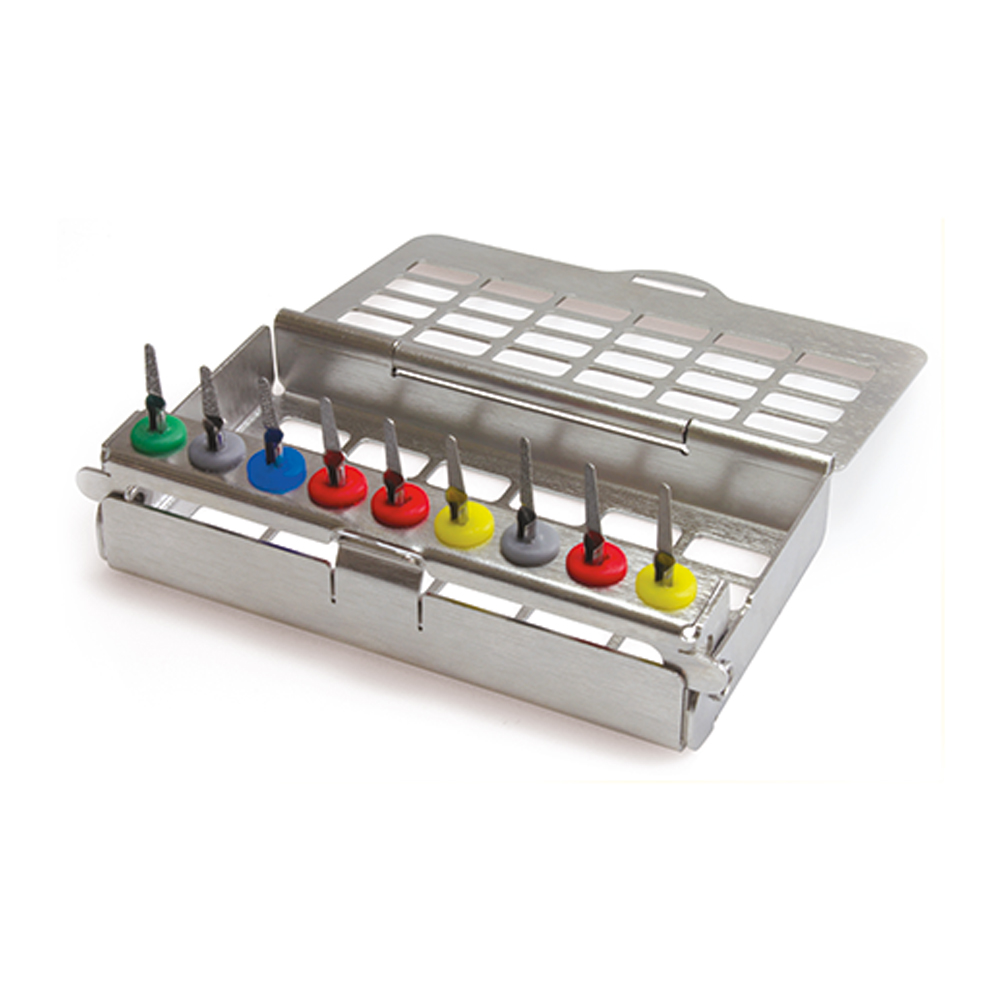 Boks til proxoshape spidser fra W&H. Der medfølger 8 stk. silikoneholdere til nem identifikation af de forskellige filer.